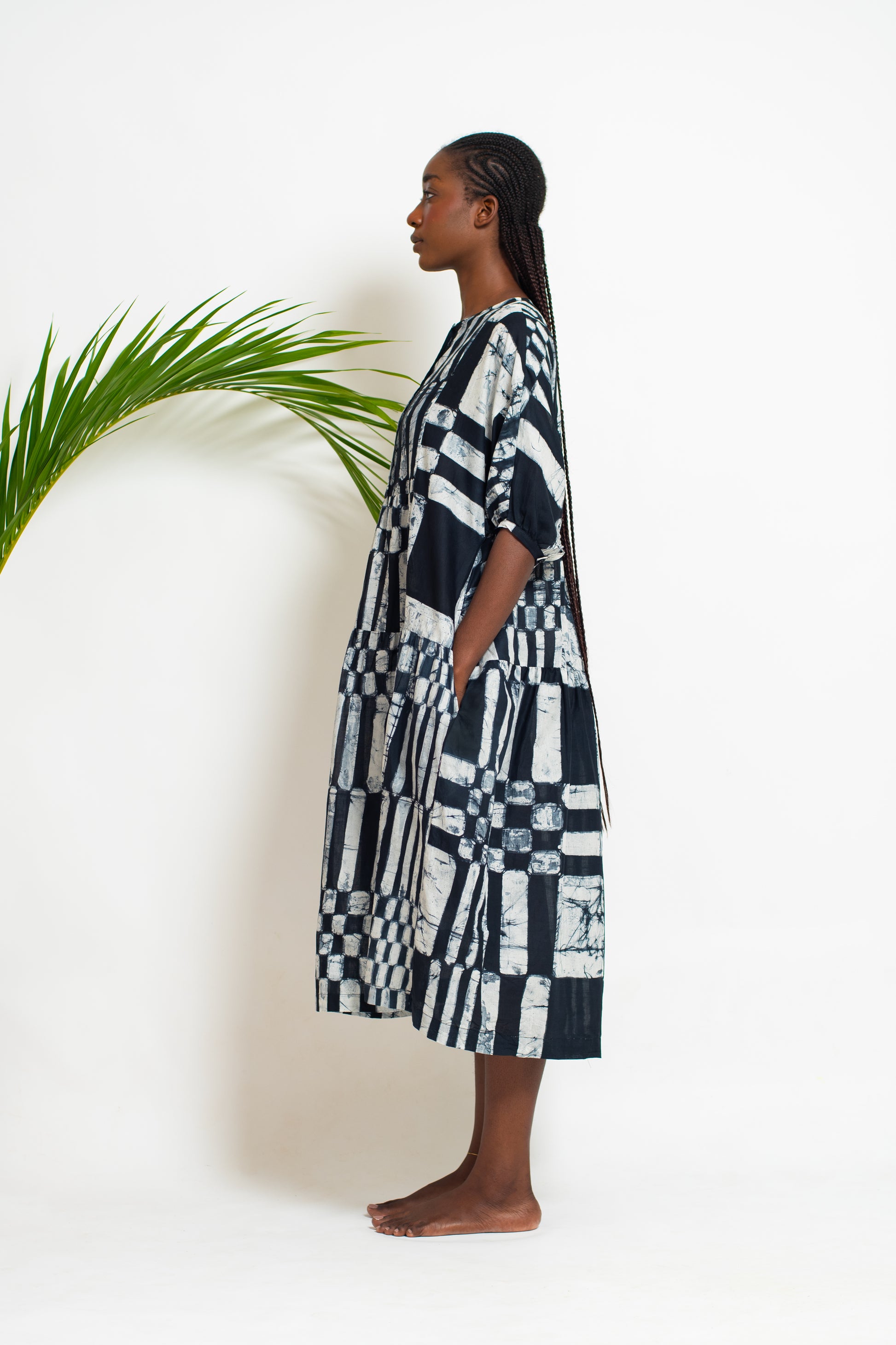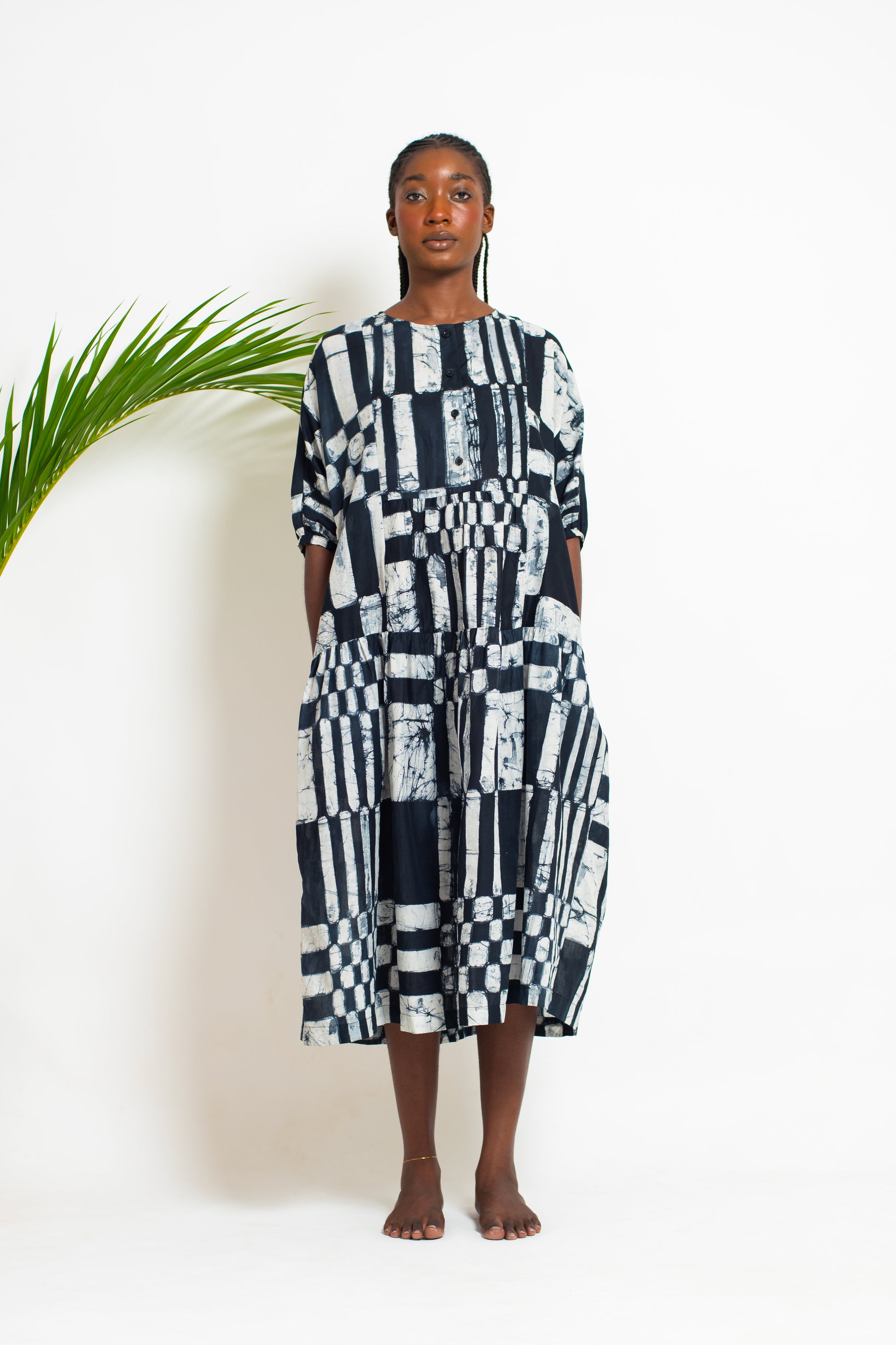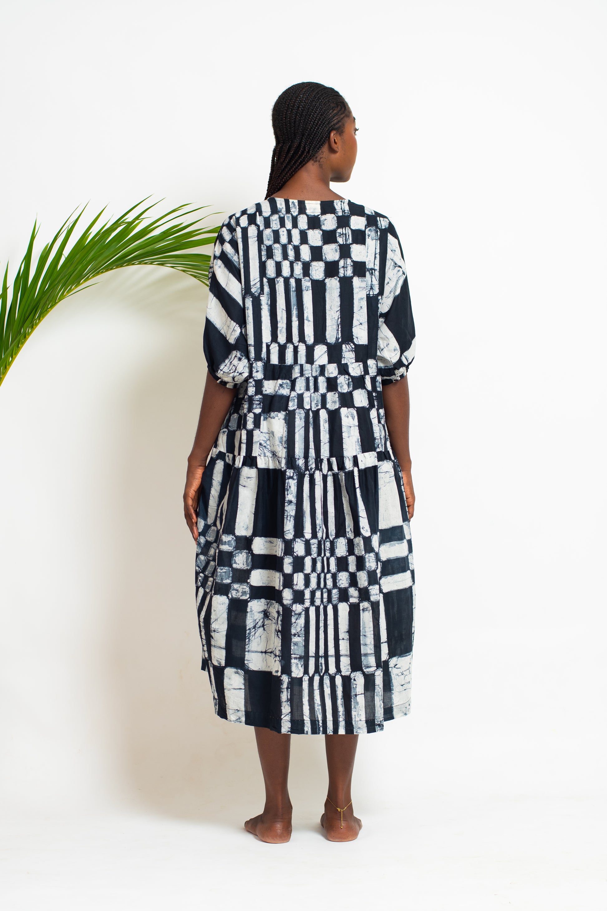 CHIMA is a voluminous, playful midi dress with short, gathered sleeves and tiered skirt.