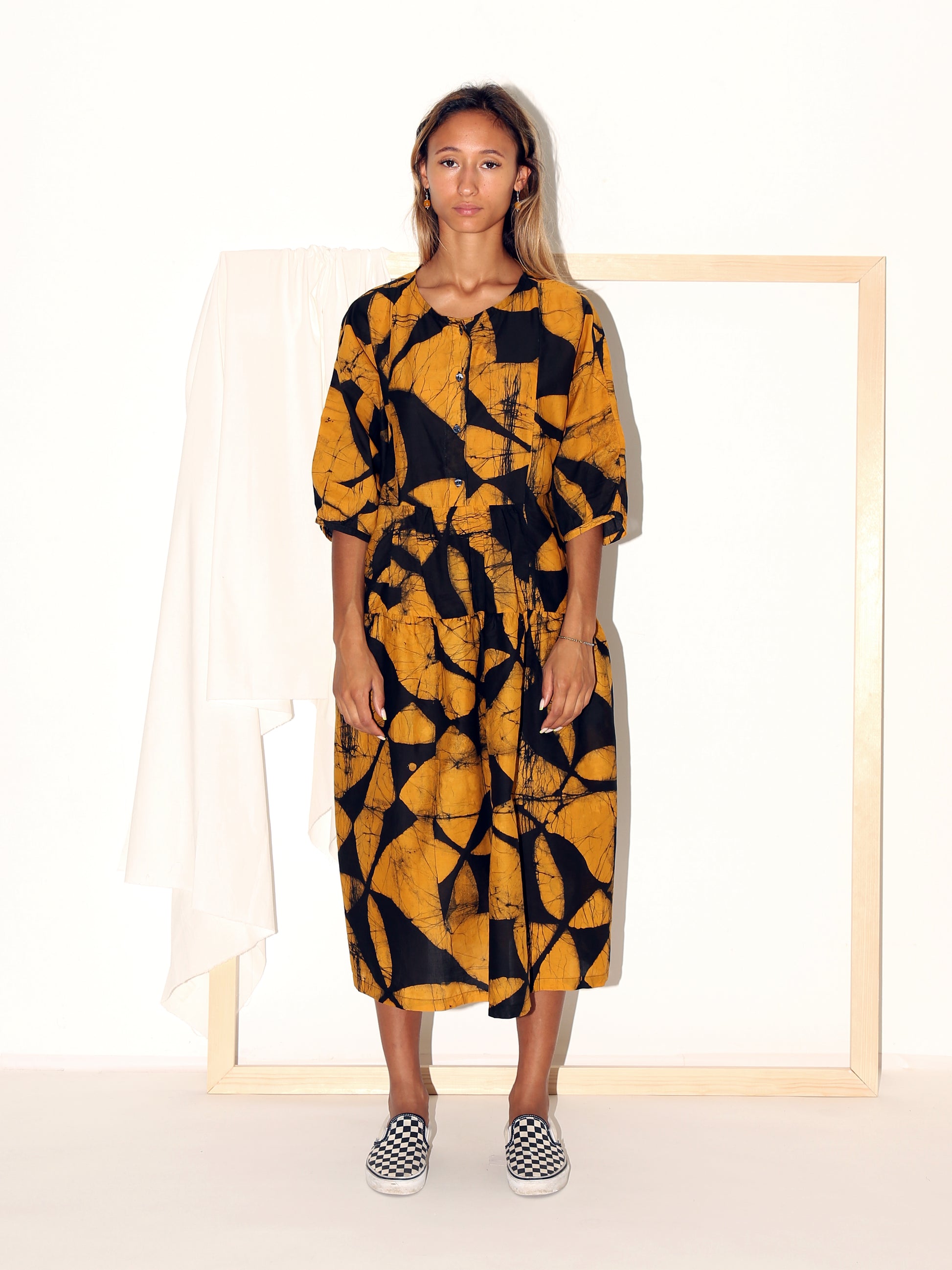 CHIMA is a voluminous, playful midi dress with short, gathered sleeves and tiered skirt. Ethically made with 100% certified organic cotton.