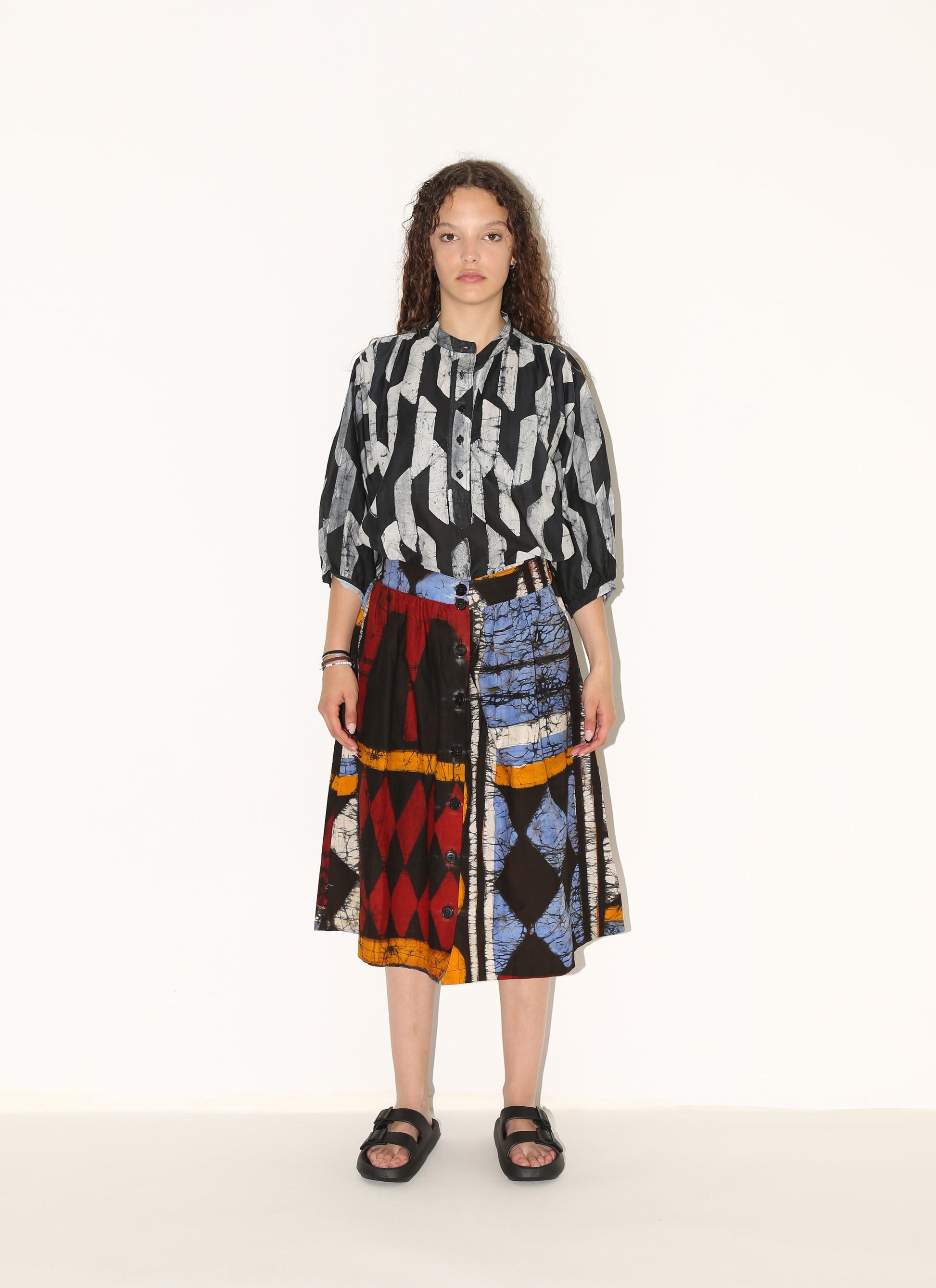 FANTA is a classic A-line skirt with a front button opening.
