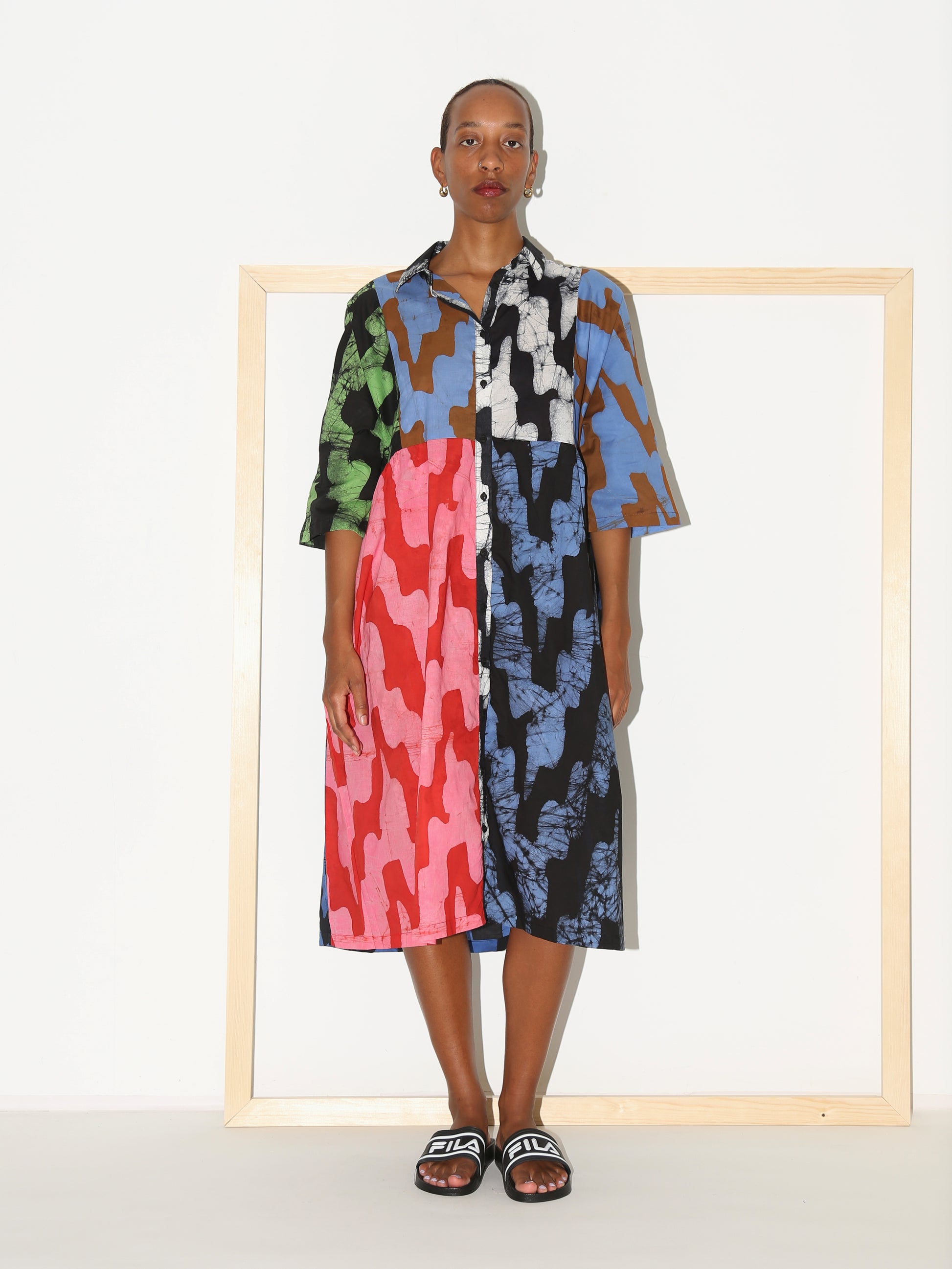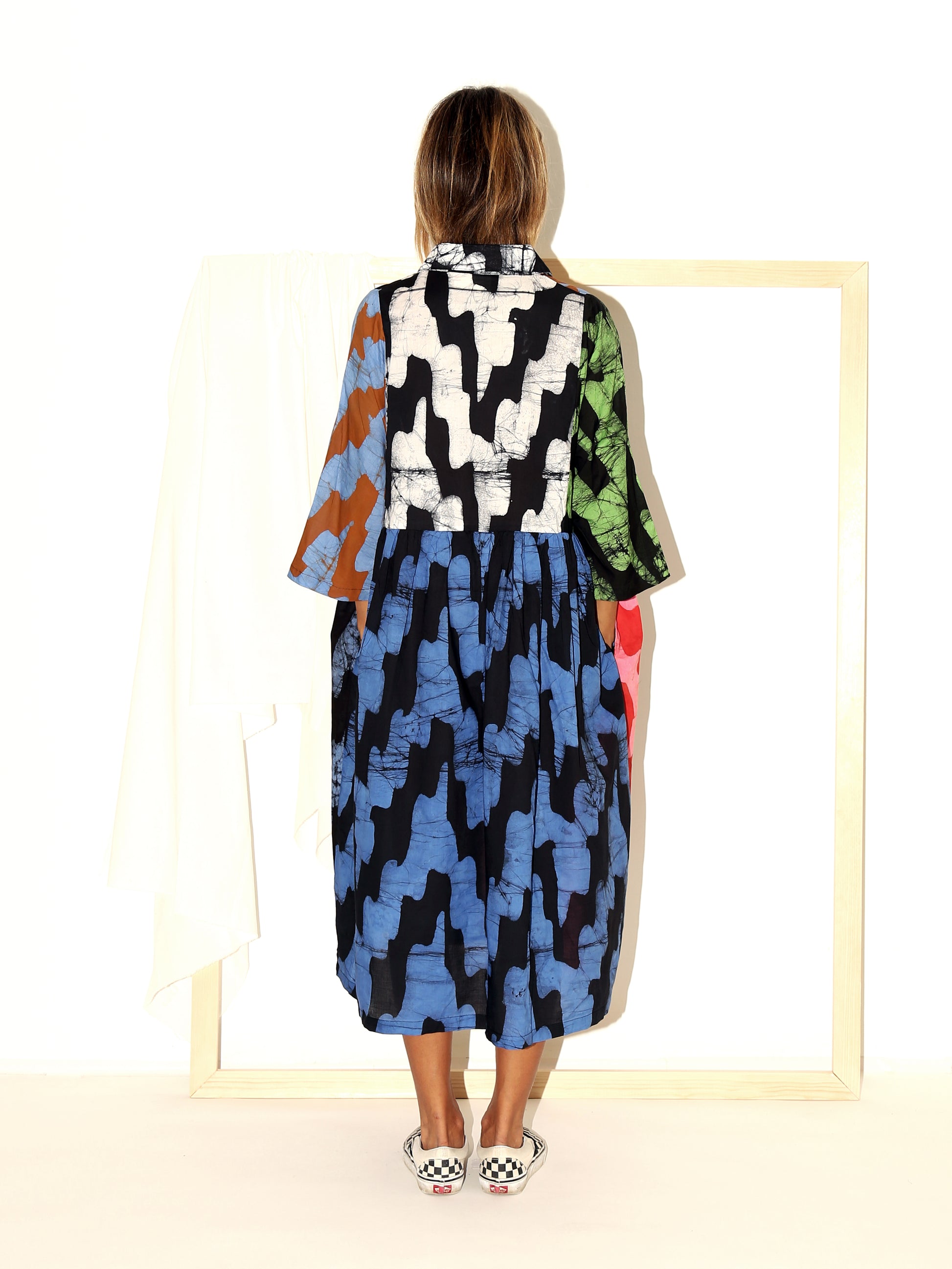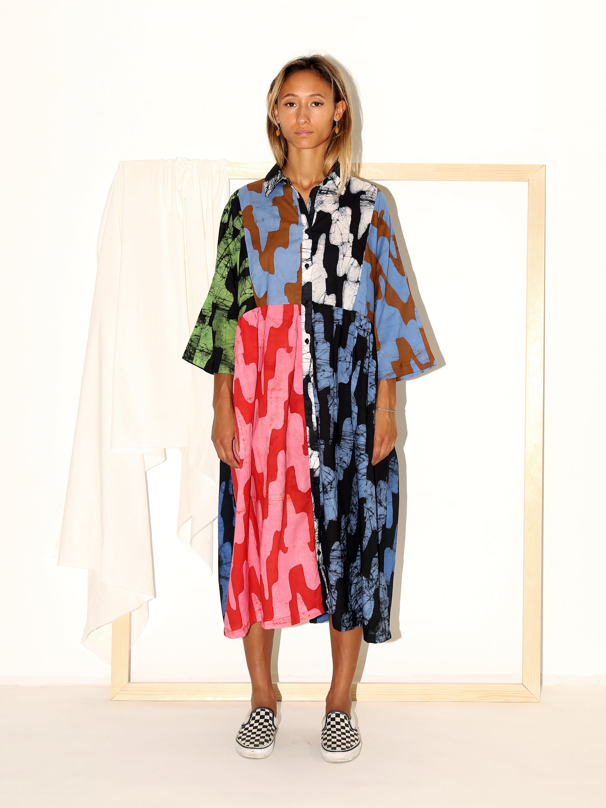 The MARLI dress is a versatile shirt dress with a gathered waist and 3/4-length sleeves that can be rolled up for a casual look. Ethically made with 100% certified organic cotton.