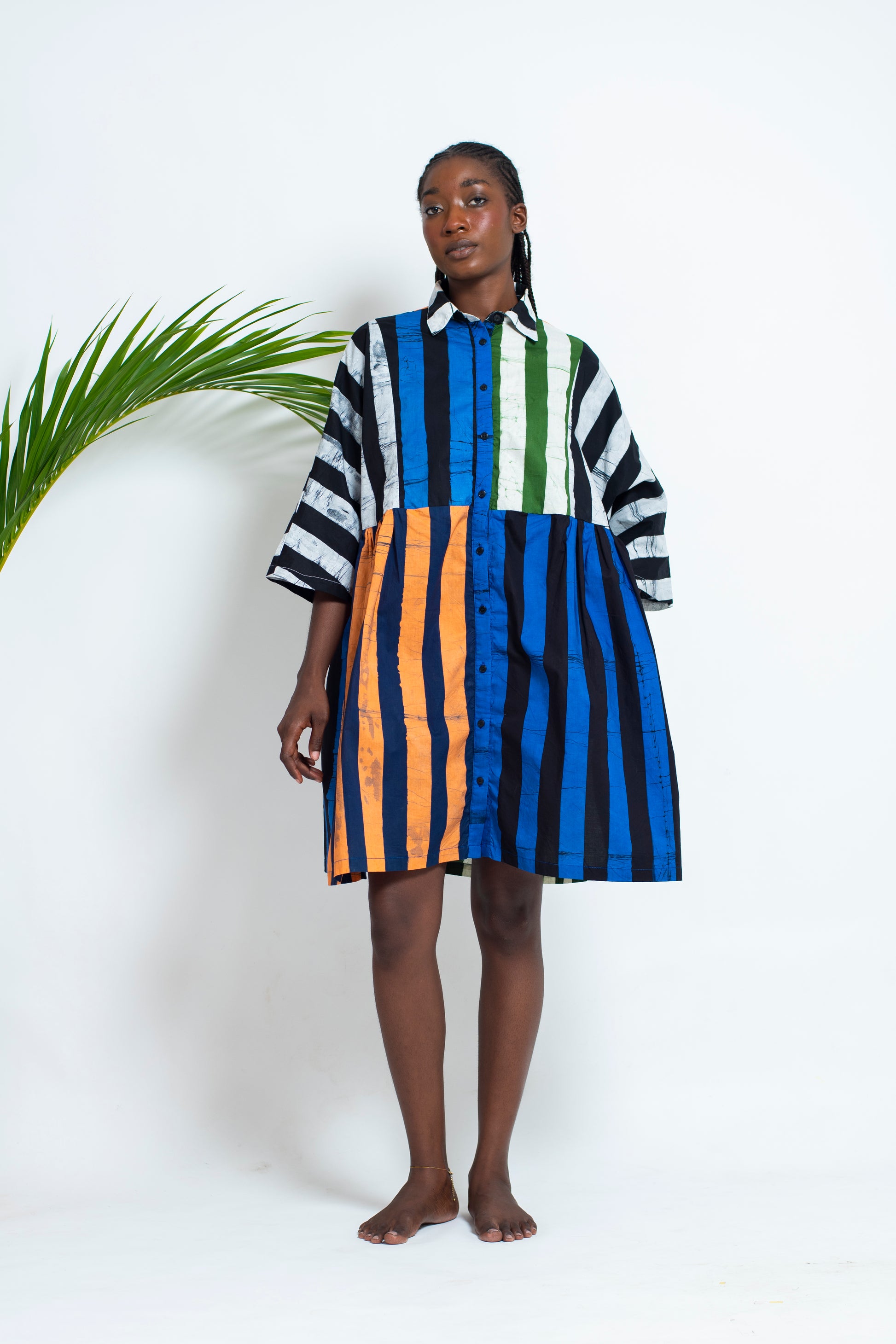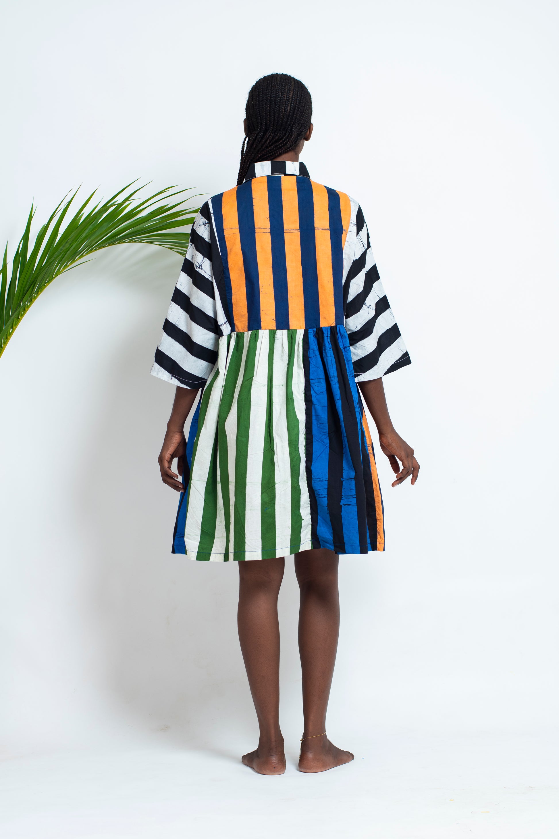 The MARLI dress is a versatile shirt dress with a gathered waist and 3/4-length sleeves that can be rolled up for a casual look. The mixed stripes add a touch of fun to this easy-to-wear dress. Dress it up or down, the possibilities are endless.